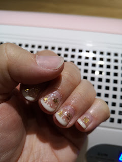 Mijn nagels waren gedaan met een basecoat, gel, metalen sneeuwvlokjes ingewerkt en afgewerkt met 2 lagen topcoat.